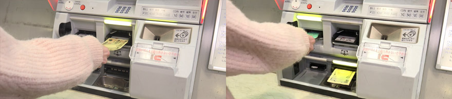 5. 기계 하단 우측에 돈을 넣고, 좌측으로 나오는 패스와, 우측 맨 아래쪽으로 나오는 거스름돈을 챙깁니다.