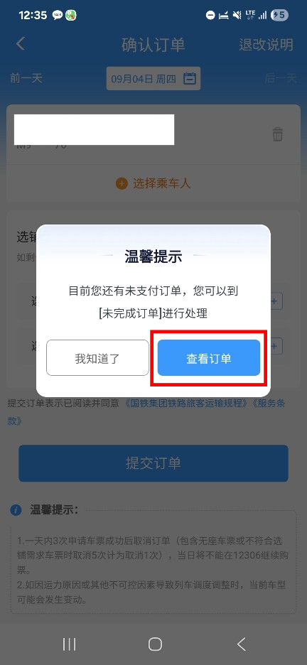 파란 네모 안의 주문제출 (提交订单) 버튼을 눌러 티켓을 예약합니다.