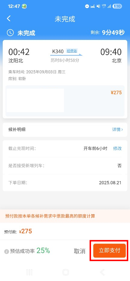 빨간 네모 안의 즉시결제 (立即支付) 버튼을 눌러 대기예약을 마칩니다.