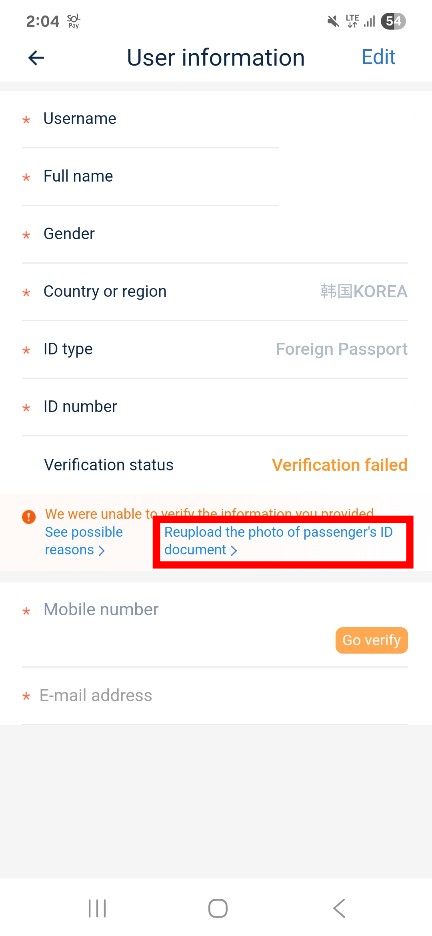 신분증 사진 다시 업로드하기 (Reupload the photo of passenger's ID document)