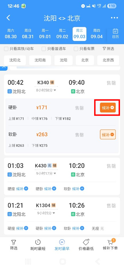 타고자 하는 열차 및 좌석을 선택한 뒤, 대기 (候补) 버튼을 클릭합니다.
