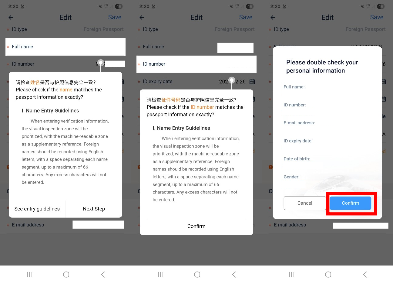 9) 입력한 정보가 여권의 내용과 동일한지 확인하는 절차를 거칩니다.
