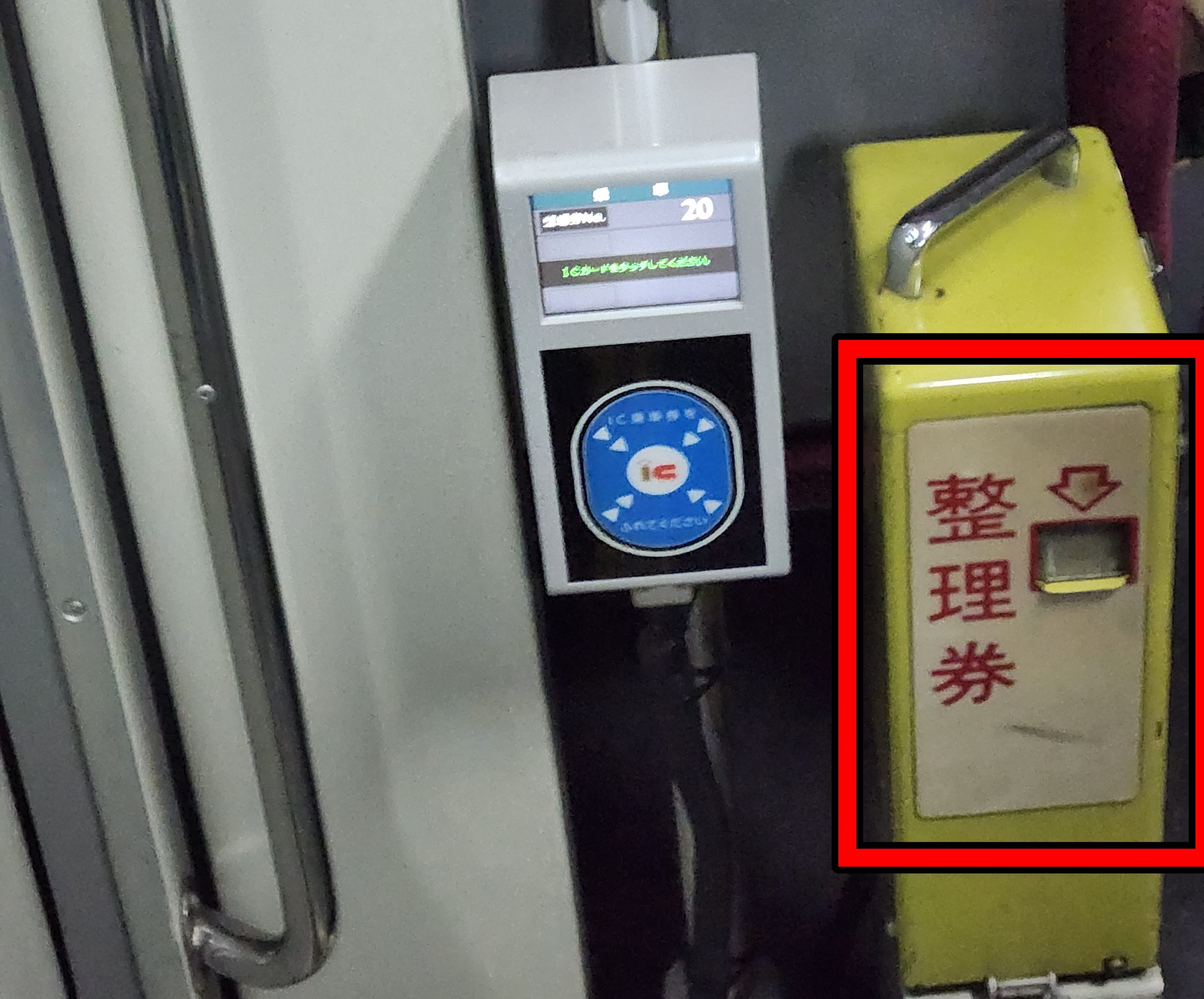 ② 손잡이 기둥에 설치된 비접촉 카드 단말기(위 사진 노란 사각형 안)에