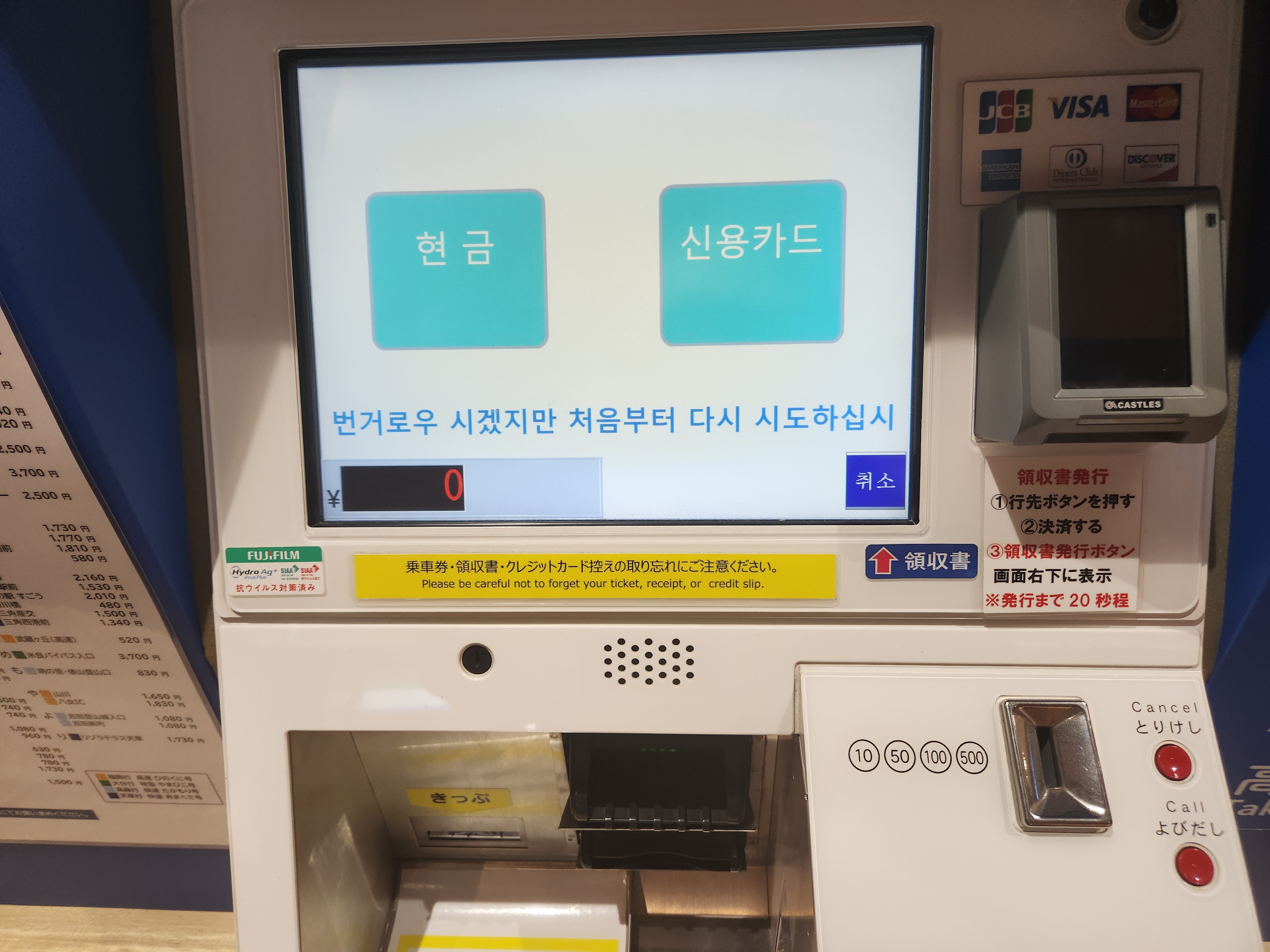 ⑦ 카드(화면 우측의 카드 단말기) 또는 현금(화면 아래의 지폐/동전 투입기)으로 요금 지불