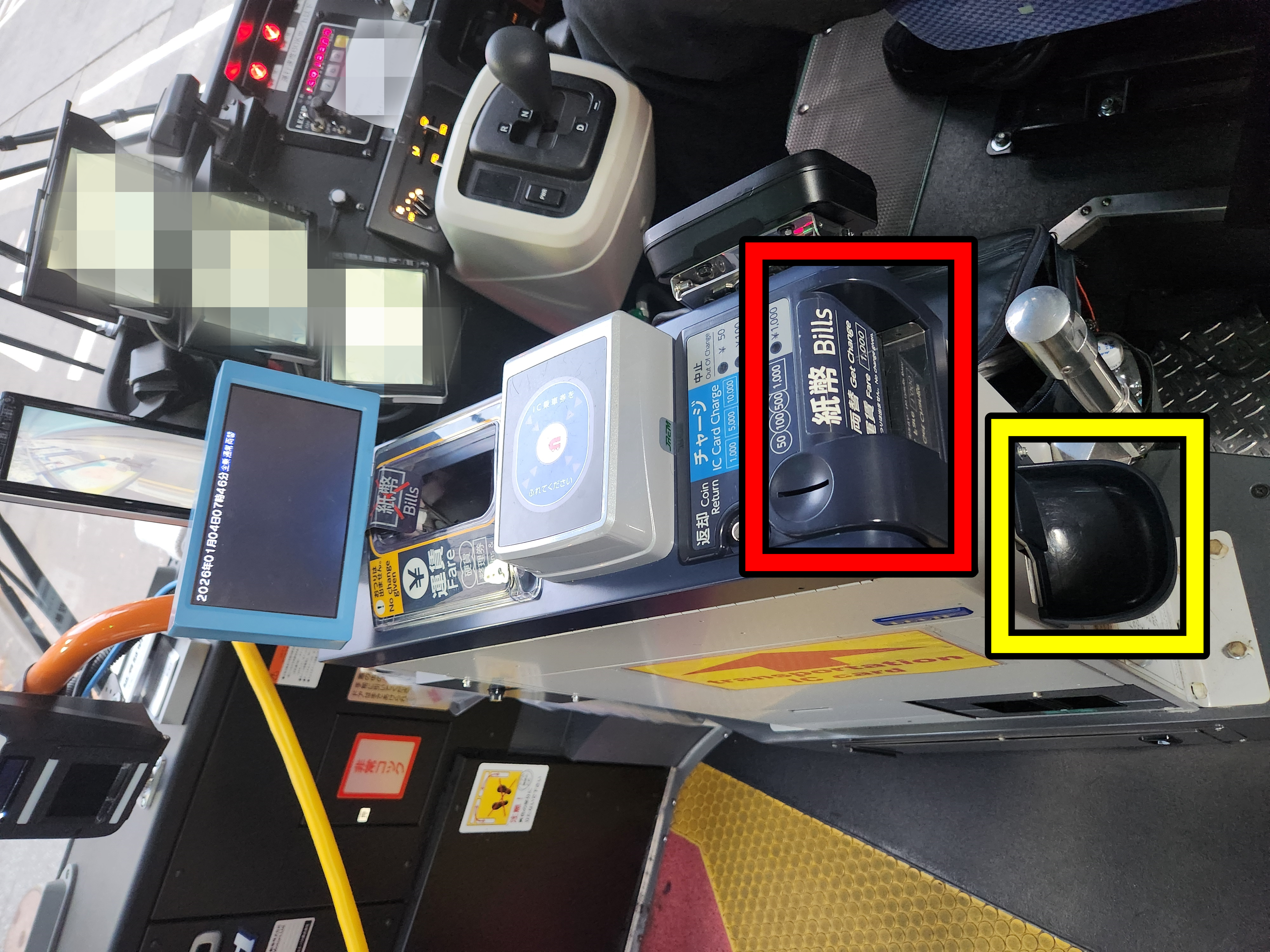 기사님 옆자리에 위치한 운임 지불기(빨간색 사각형 안)에 정리권(整理券)과 운임 넣기