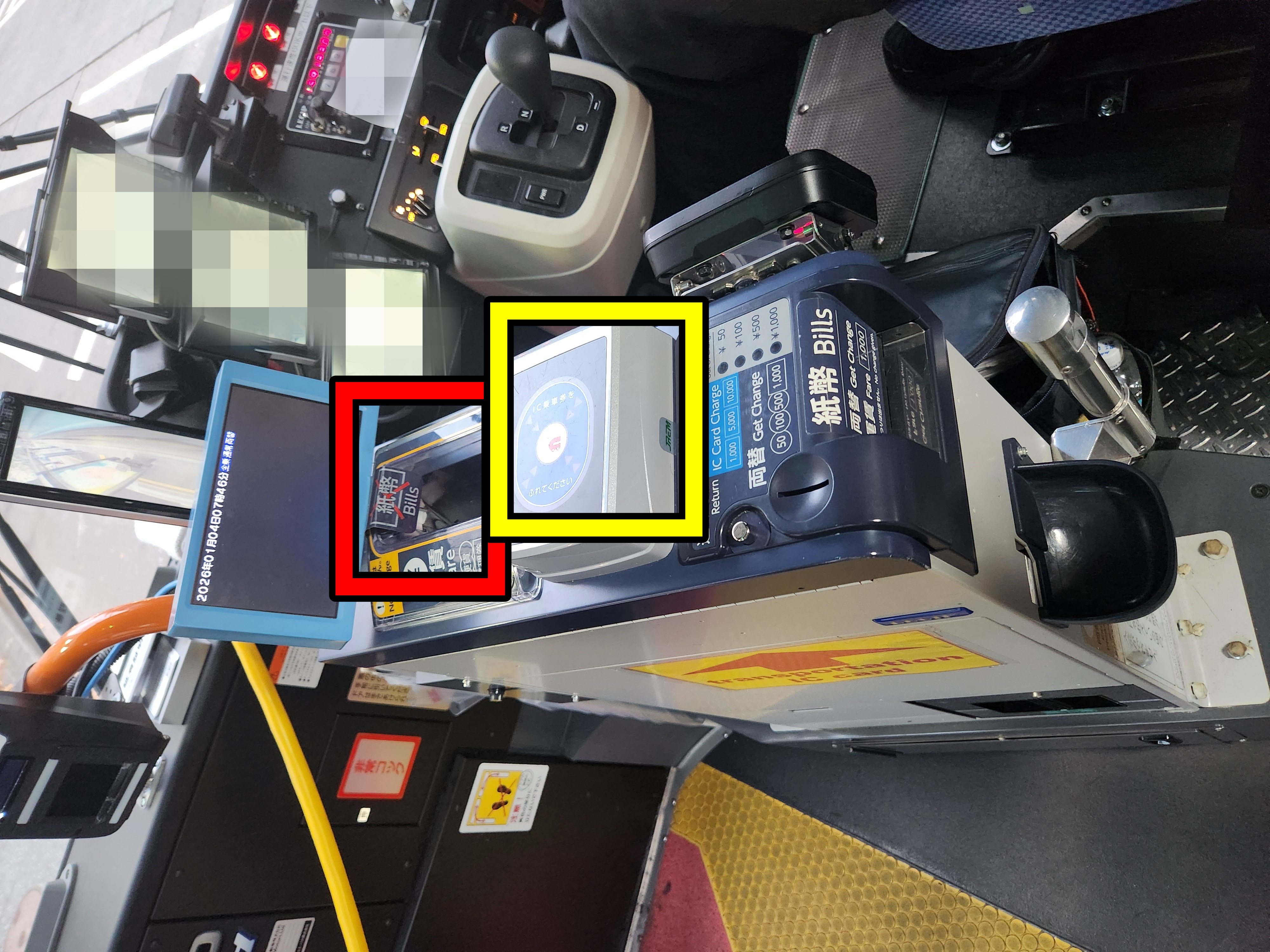 기사님 옆자리에 위치한 운임 지불기의 교통카드 단말기(노란색 사각형 안)에 카드를 태그